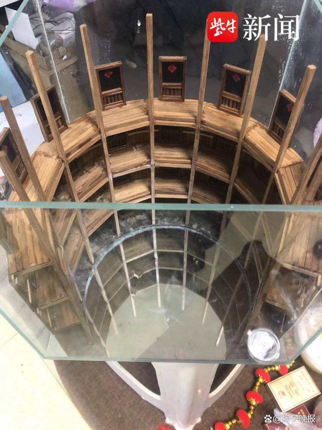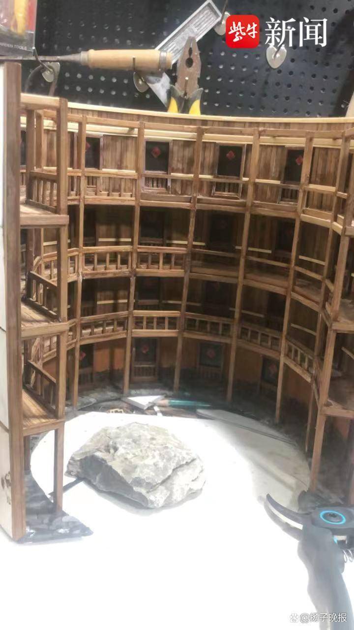 那么视频当中如此细致又逼真的土楼是怎么来制作出来的呢?据宛如透露,在确定要做这个作品后,他从网上打印了电影中土楼的海报,并根据比例将碳化竹条裁剪好,然后再找来一个长宽高均为30cm的玻璃鱼缸,固定好底部之后一点点开始搭建。先做框架,再装门窗,最后再把屋顶铺设的瓦片粘贴上去。宛如和记者说,制作土楼其实难度不高,但对耐心的要求特别高。“这些瓦片都是8毫米*6毫米大小,总共有1400片,需要用镊子一片片粘上去,过程非常痛苦。”