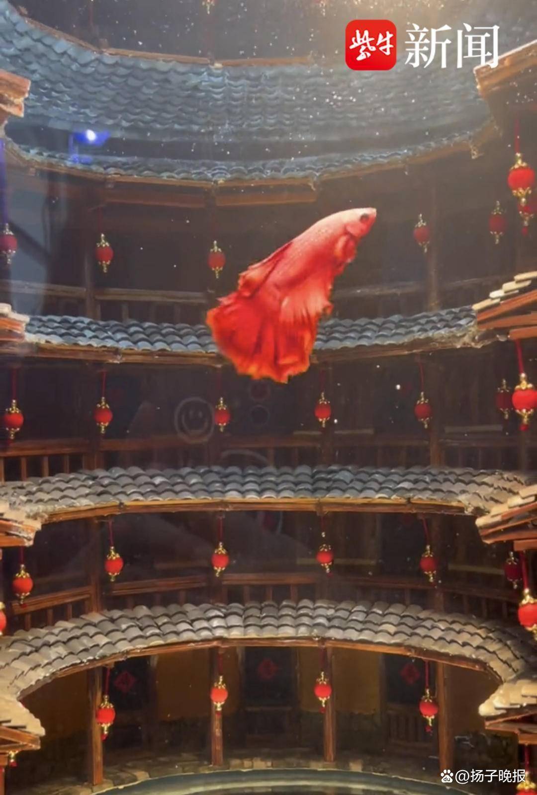 国产动画电影《大鱼海棠》中,女主角椿居住的巨大环形土楼让人印象非常深刻。近日,徐州一小伙就把这座土楼按照比例“搬进”了鱼缸里。根据造景师宛如拍摄的画面显示,在一层层挂着红灯笼的精致土楼前,一只小红鱼摇曳着身姿在水中游荡,完美复刻了电影中红色的琨在土楼上飞翔的画面。不少网友评论直呼“美呆了”“还以为是特效!”