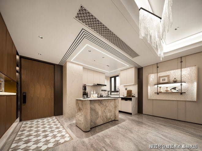 在门庭的环岛空间,景墙面采用中轴对称的设计布局,定制了奢石镶嵌装饰,将曲面艺术与经典石器之美圆融交融。