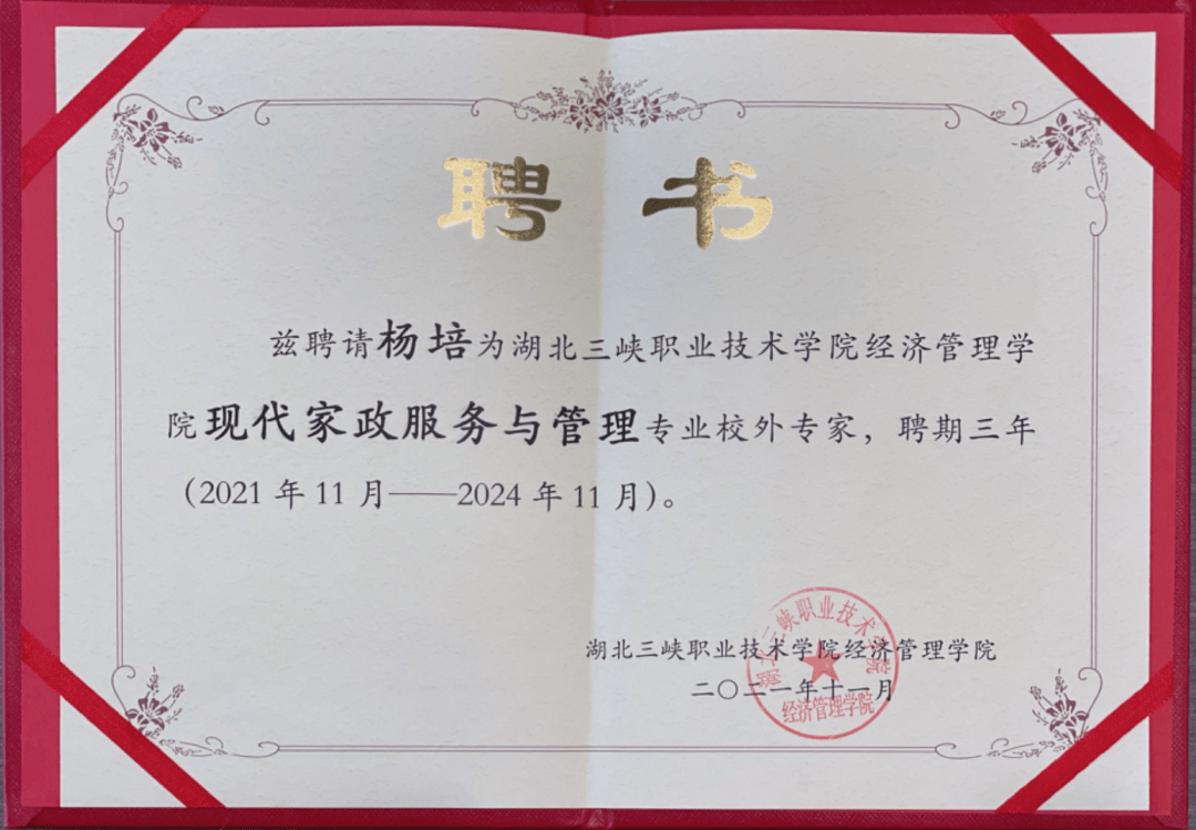 2021年,杨培被湖北三峡职业技术学院聘请为现代家政服务与管理专业校外专家。