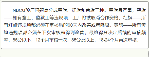 4. 如果工厂存在不符合规定标准的问题,NBCU会要求供应商采取对应的整改措施,并设立整改时间表。