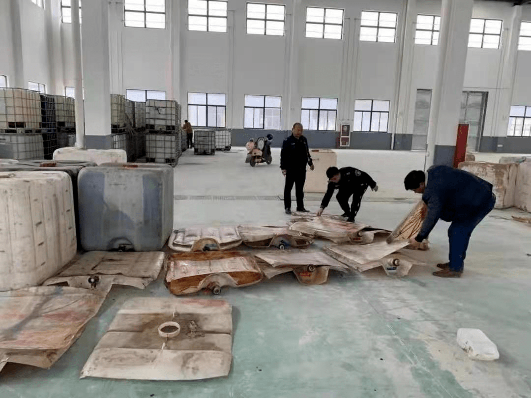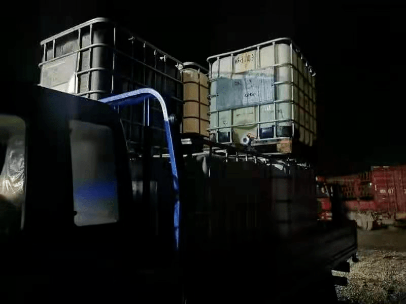 法律队连夜安排人员对场所上的废包装吨桶、废吨桶切片及废胶水施行搬运扣押,并一同进行称重清点,共清点出废包装吨桶(含切片)198个、废胶水800kg,总重约4吨。